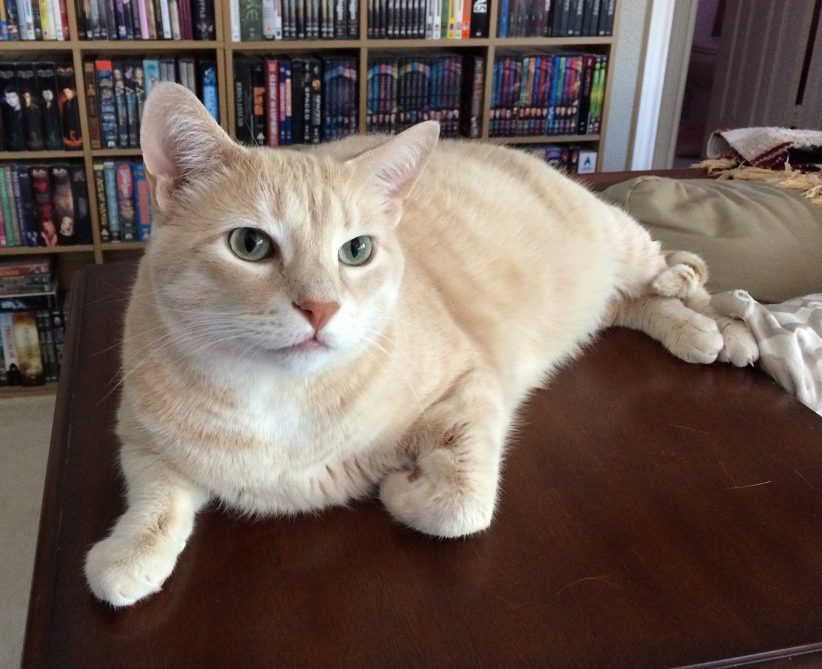 What can I say about Mom? She’s really good at scritches, listening to me when I’m in the mood to talk (which is always), cleaning our litter boxes, giving treats on demand, and letting me have pieces of her pork chops (I really, really, REALLY love pork). Oh, and apparently she writes, as well—I’d rather play with yarn, but hey, whatever floats her boat.