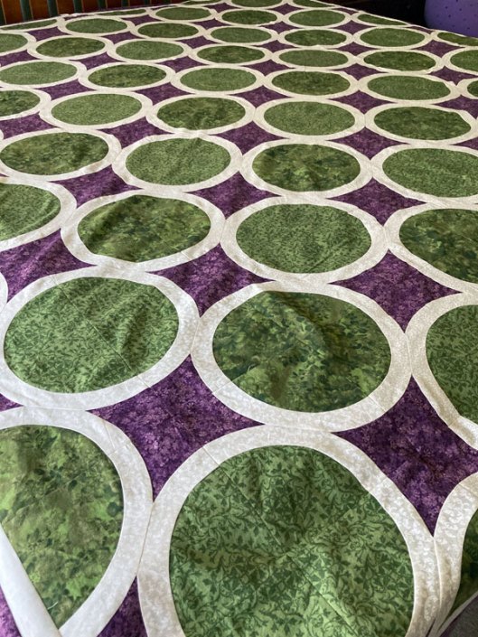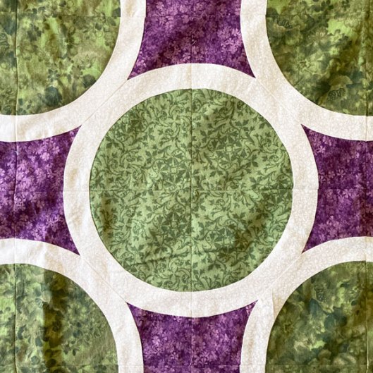I now have two office garbage cans full of stripped-off white cotton and my seam ripper got one hell of a workout last week. But I wound up with thirty circular motifs which I appliqued onto squares, then put together into a lattice. I’d gone out and purchased the fabric for the border, but after adding a 4″ border I looked at it and thought, “…that looks really narrow.”