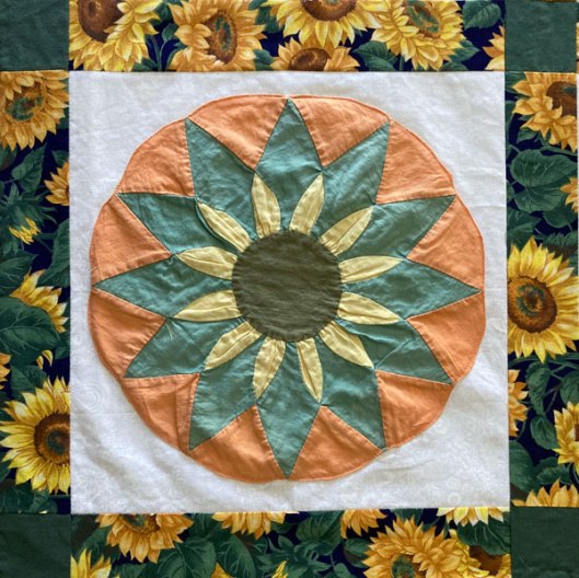 Back in 2002 or so I’d found a quilt top made from thirty hand-sewn sunflowers attached to a white cotton surround. The white cotton was fraying badly but apart from some bleaching here and there the sunflower motifs were still in pretty good condition.