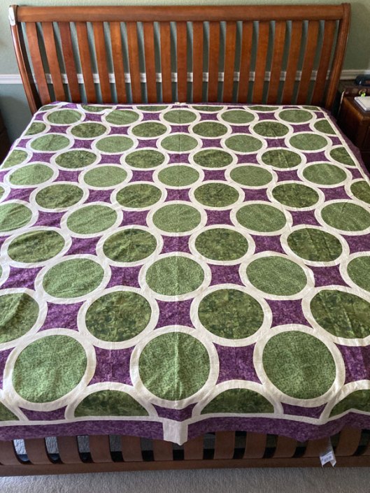 I now have two office garbage cans full of stripped-off white cotton and my seam ripper got one hell of a workout last week. But I wound up with thirty circular motifs which I appliqued onto squares, then put together into a lattice. I’d gone out and purchased the fabric for the border, but after adding a 4″ border I looked at it and thought, “…that looks really narrow.”