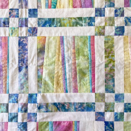 Library of Dreams is a twin quilt made with batik strips I’d picked up at the Dallas Quilt Show a couple of years ago matched with latticework made from white-on-white cotton fabric and a pretty cool-colored batik (which also serves as the border). This one is for my niece Jessica (and if any family members read this I’m happy to make a quilt for you—just tell me size and color preferences and don’t expect it before December).