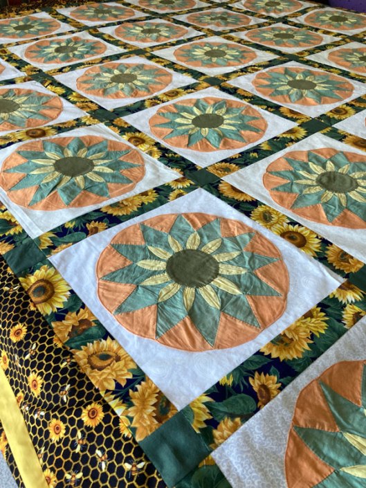 Sunflower Memories is a queen quilt made with antique sunflower motifs appliqued to white-on-white cotton squares and set in lattices made from dark green and sunflower fabric. The border is made from a floral fabric featuring sunflowers, bees, and a golden honeycomb pattern on a black background with a gold stripe and pale orange corner squares.