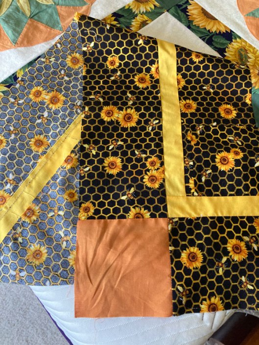 A quick trip to Joann later, and I had a golden stripe around the existing border, then added the remaining black honeycomb fabric strips with light orange corner squares that echoed the orange in the motifs (frankly, I’m utterly shocked that I was able to find a color that matched so closely). And what had originally been a full quilt became a queen quilt.
