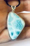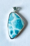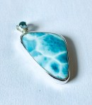 Caribbean Blue is a gorgeously simple sterling setting for a larimar cabochon with an aquamarine-studded bail textured to look like foaming water.