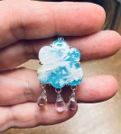 Silver Lining is a cloudy quartz cabochon with a blue backing in a sterling silver claw setting with three little iridescent raindrops. So incredibly cute, and a reminder that every cloud has a silver lining.