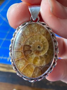 To my surprise the polished ammonite pendant has already been sold. I’d originally made it for myself, but when I posted these pics on FB a friend said, “Ooh, can you make me one?” Since I’m pretty sure I can pick up more of these ammonite slices I decided to sell this pendant to her.