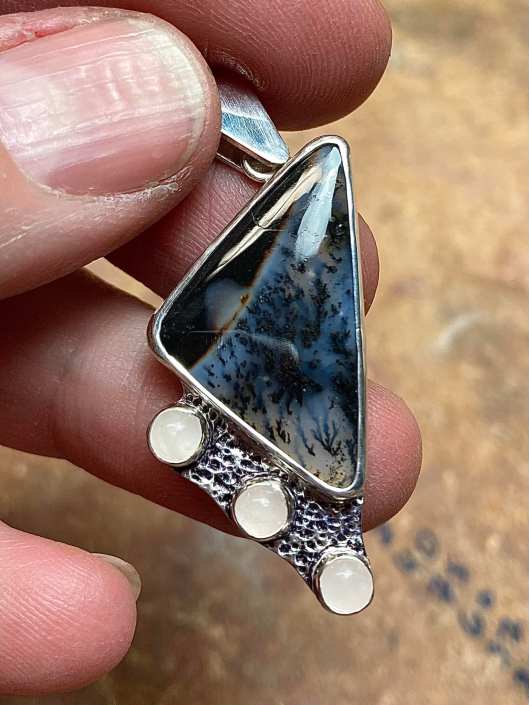 Got the dendritic quartz with moonstone cabochons set in sterling silver with a handmade bail, and even I’m surprised at how well this turned out. A friend said that it looks Art Deco-ish, and Lyndon says that it looks futuristic. I added the texture on the back plate with a very small ball burr for some visual interest (and to kinda make it look like the surface of the moon), and with the offset jump ring and bail it hangs straight on a chain.